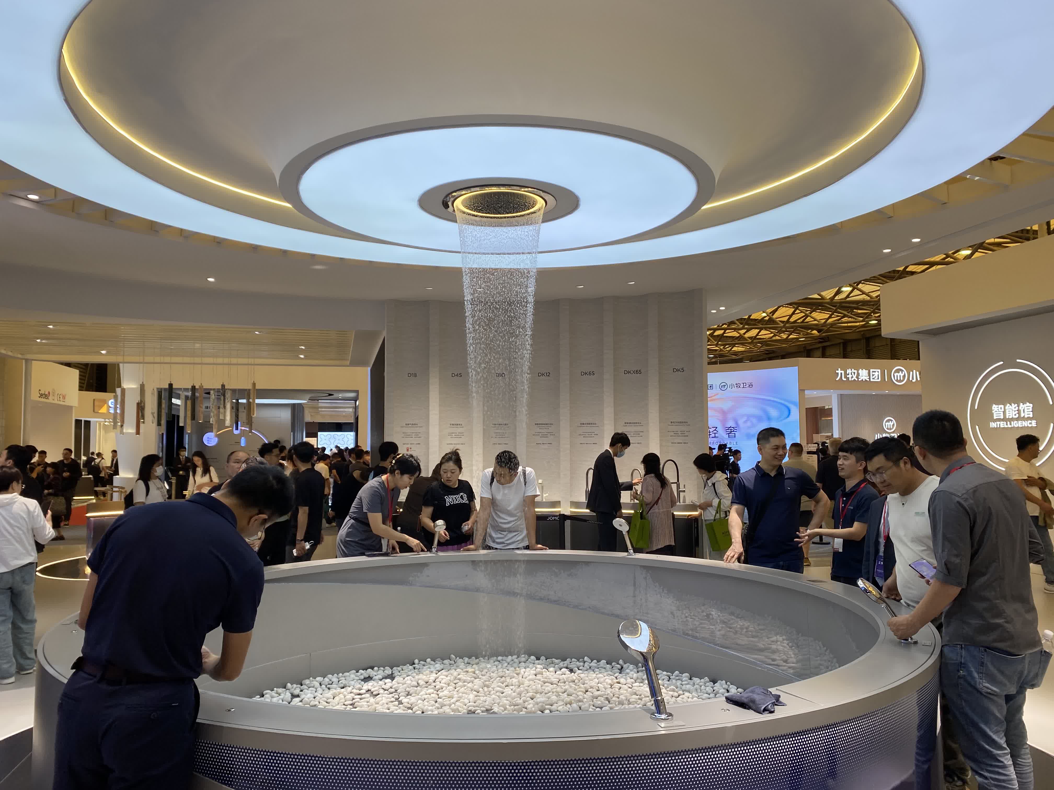 在颜值馆内部,九牧就搭建了一个直径长达近5米的花洒效果展示位,展示将近10个花洒产品,观众可以直接手动体验不同产品的淋浴效果。