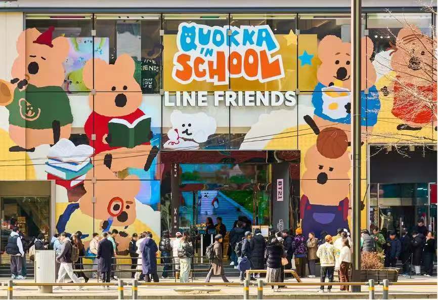 而相比早期单纯依赖打卡的布朗熊餐厅,如今的LINE FRIENDS也更加注重内容生产——譬如与Bilibili一起推出连载漫画、为经典IP开发动画与绘本,以及与已有成熟内容体系的IP形象合作产出周边。全国不间断的快闪活动,也成为这些IP进一步贴近消费者生活的渠道。