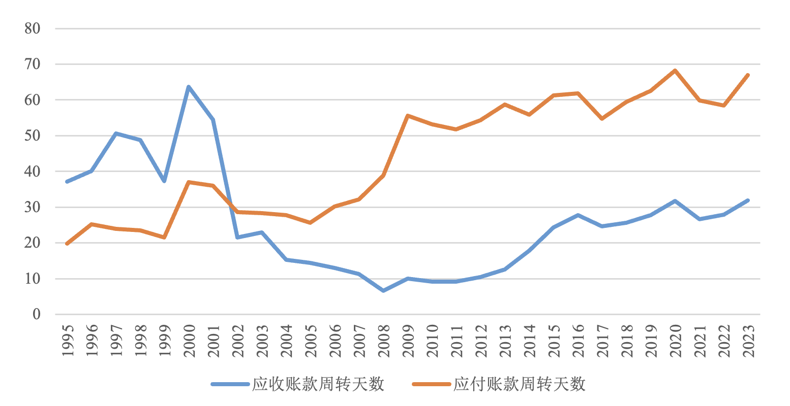数据来源:上市公司年报数据,按营业成本规模加权计算。应收账款周转天数=应收账款期末余额*360/营业收入。应付账款周转天数=应付账款期末余额*360/营业成本。