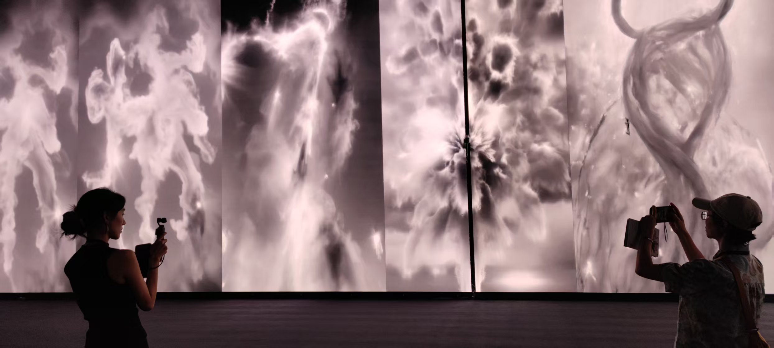 AI与艺术的联动上,蔡国强一直都走在前沿。202411月,他在澳门妈阁塘片区举办了关于人工智能cAI™的全球首次个展《cAI™:灵魂扫描》,大半年后,这次展览来到了2.0版本。在去年的展览中,收集了八万条左右的数字烟花,这些成为cAI™的记忆素材,构成了新展核心装置的基底。当观众步入这一空间中时,cAI™已经开始对其进行分析,从而在自己的记忆中搜寻出最符合对方当下状况的数字烟花在大屏幕上进行播放。
