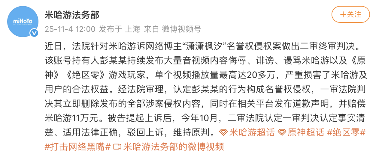 据米哈游介绍,该账号持有人彭某某持续发布大量音视频内容侮辱、诽谤、谩骂米哈游以及《原神》《绝区零》游戏玩家,单个视频播放量最高达20多万,严重损害了米哈游及用户的合法权益。