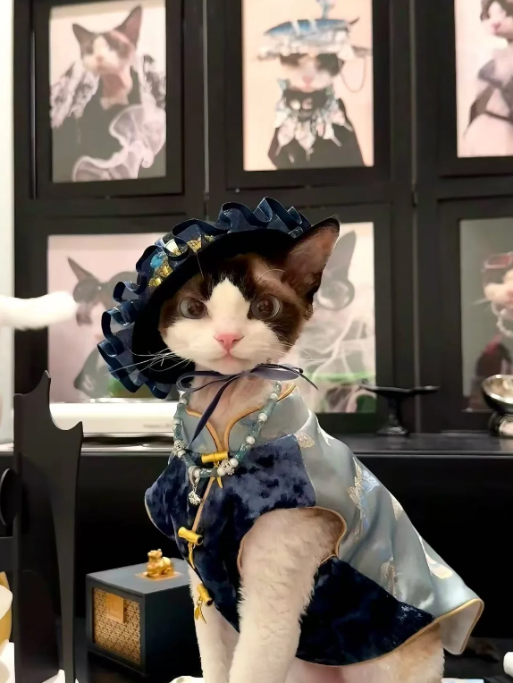 一开始,我想给我家的长毛猫买个口水巾,结果发现不管在哪个平台,几乎都找不到新中式风格的宠物服装。即便有,质感也很差。市面上更常见的款式虽然像童装,却远没有达到真正童装或婴儿级面料的质量。