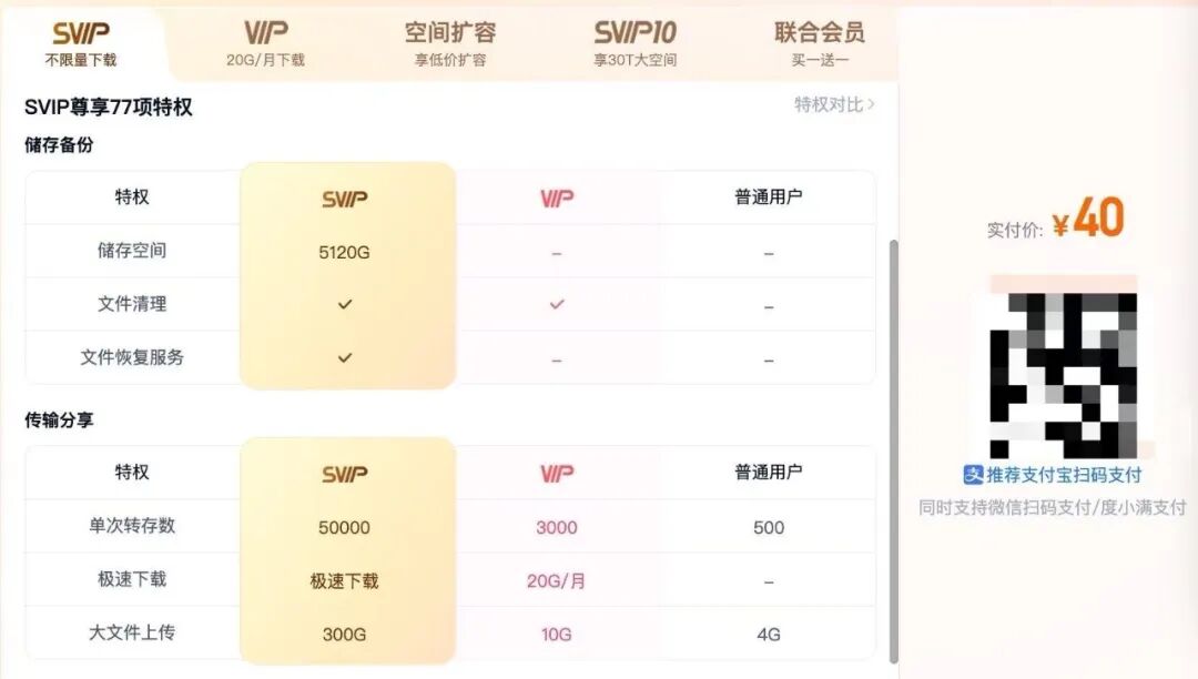 每月支付40元开通百度网盘SVIP服务。