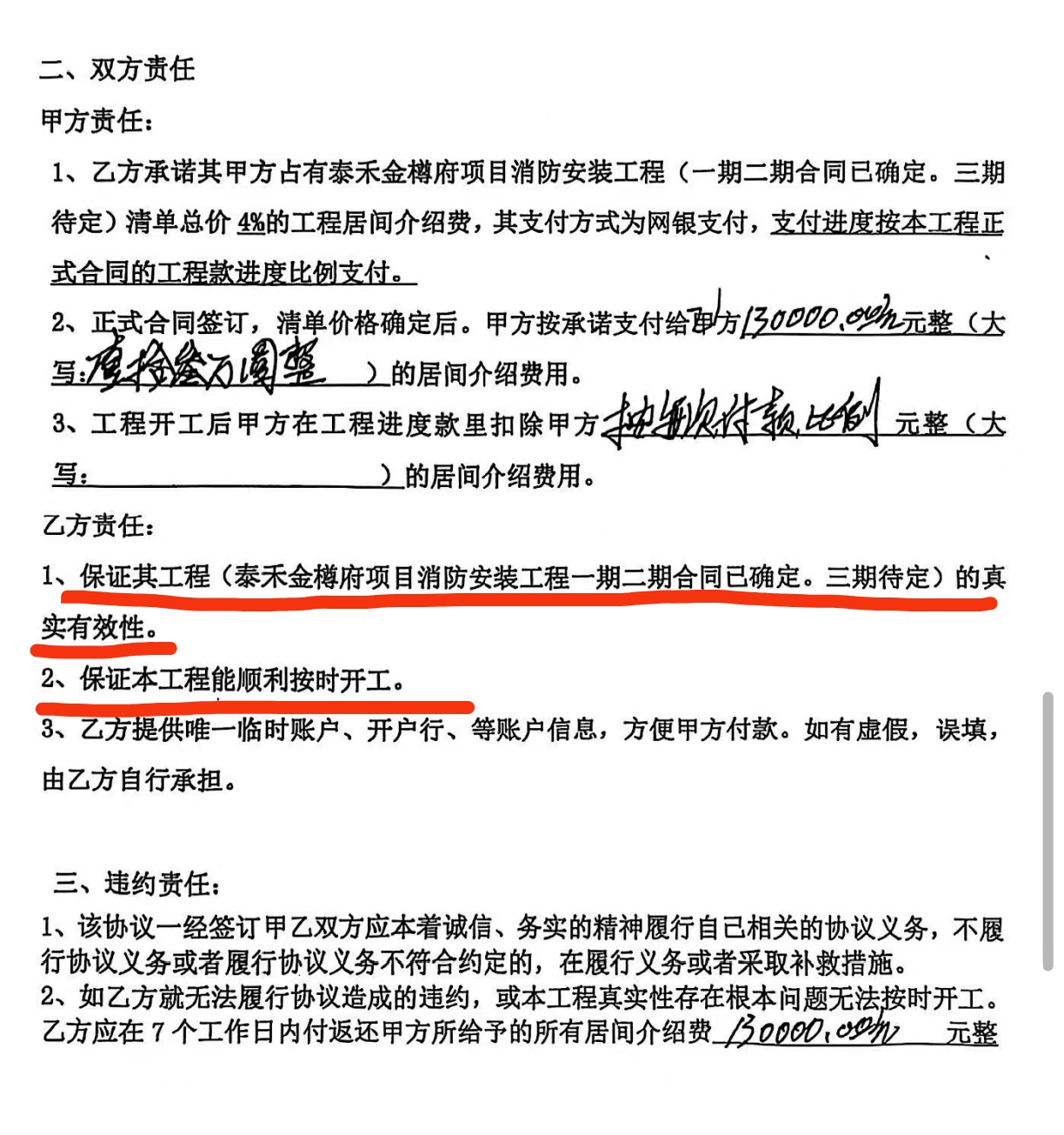 当年12月22日,三方完成了关键文件签署:杜斌与赵波签订居间协议,同时与中宏天佑山西分公司签订了消防工程合同书。居间协议约定,赵波应确保“保证工程真实有效、保证工程顺利按时开工”,杜斌则需支付13万元居间费。当日,杜斌将13万元居间费转入赵波个人建行账户。