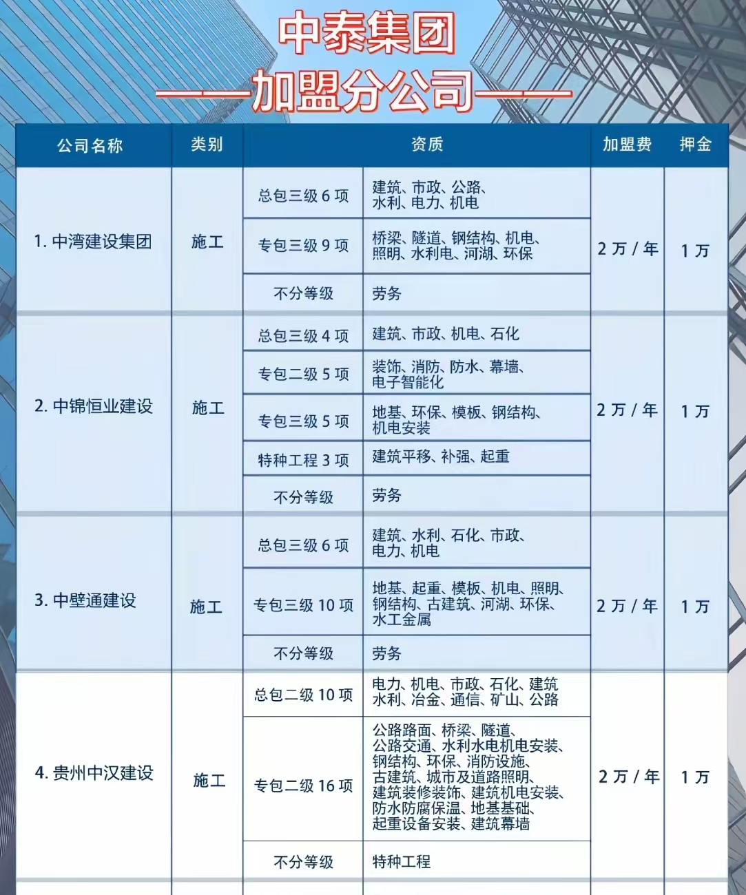 界面新闻获取的中宏天佑招商推广资料,以及对十多位分公司负责人的采访显示,其核心业务模式即向全国包工头、中小施工队推出“资质加盟分公司”服务,加盟方缴纳数万元到十余万元不等的费用,即可注册成立中宏天佑的分公司,使用总公司宣称的“一级资质”,以总公司名义承接工程、参与招投标。