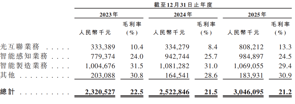然而,华工科技的光模块业务毛利率却最低。2023年至2025年,其光互联业务毛利率分别为10.4%、8.4%、13.3%,智能感知业务板块的毛利率分别为24%、25.7%、24.5%,智能制造业务的毛利率分别为31.5%、31%、29.4%。