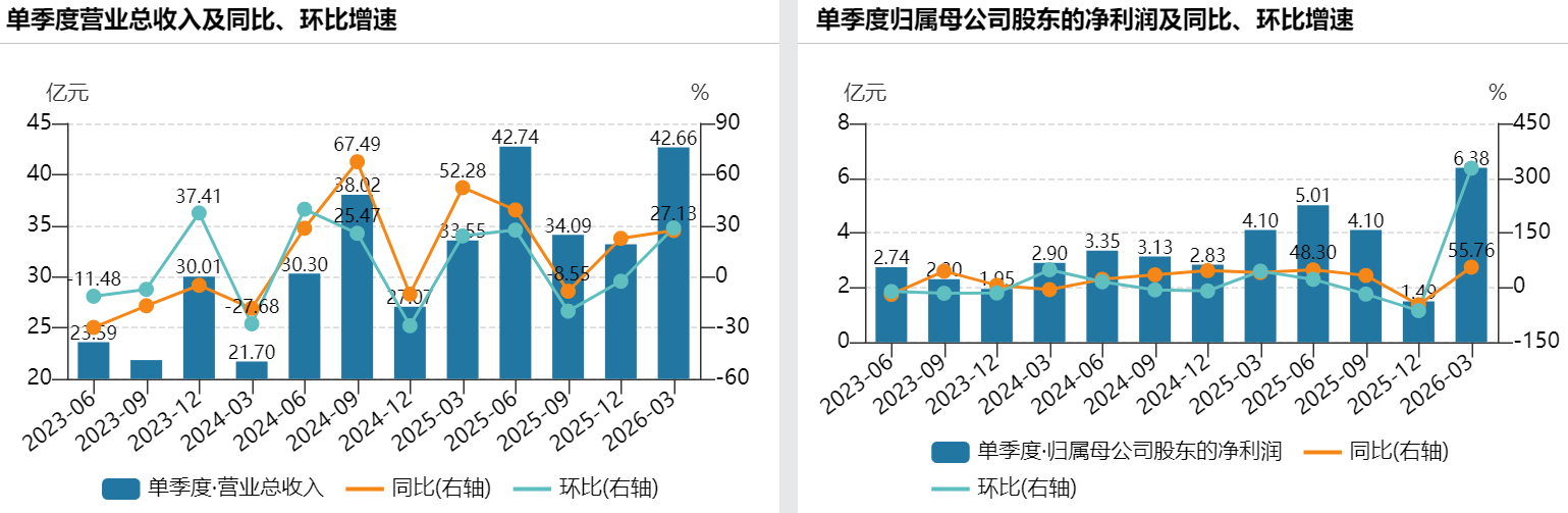 根据一季报,华工科技实现单季度营收42.66亿元,同比增长27.13%,环比增长27.13%;归母净利润6.38亿元,同比增长55.76%,环比增长327.1%;扣除非经常性损益后归母净利润为3.73亿元,同比增长20.51%,环比增长347.45%。