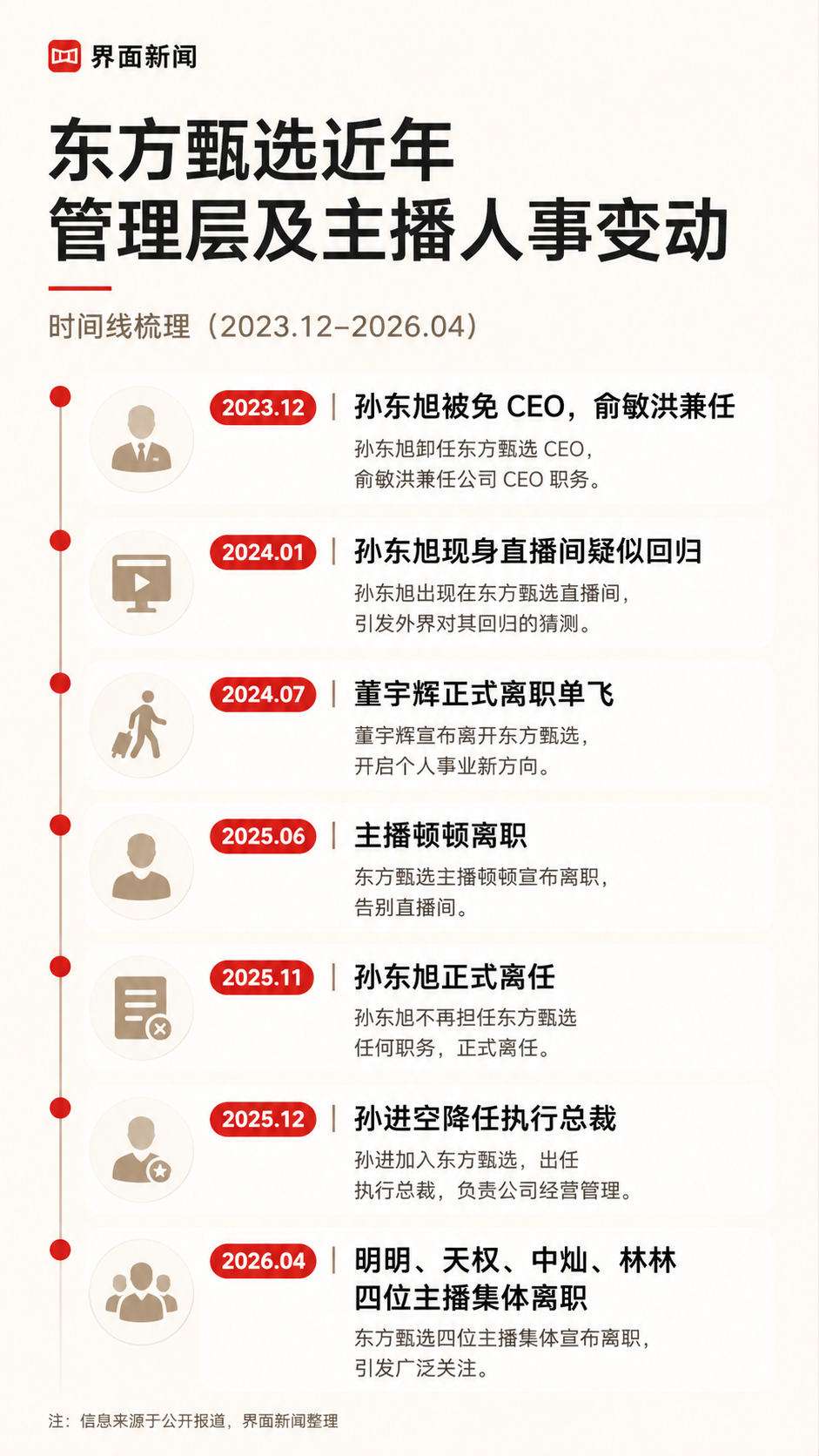 在主播的叙述中,对管理层的不满、对公司管理风格的不认同,让外界将矛头对准东方甄选现任CEO孙进。在上一个“话题人物”、东方甄选前CEO孙东旭离职后,孙进于2025年12月加入东方甄选,进行了一番改革。