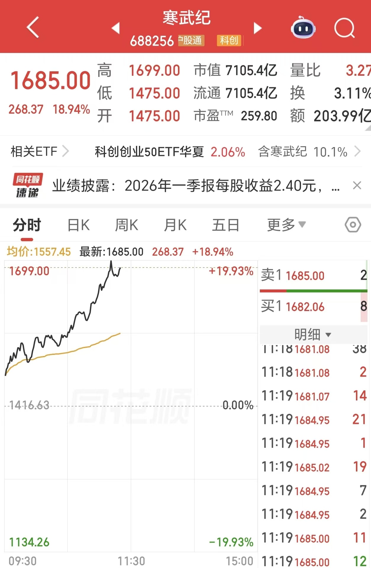4月30日,寒武纪(688256.SH)股价一度大涨19.93%。截至界面新闻发稿前,其股价涨幅为18.94%,报1685元/股,超过源杰科技(688498.SH)股价,重回A股“股王”。