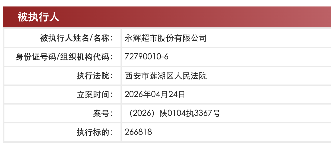 中国执行信息公开网显示,4月24日,永辉超市(601933)新增一则被执行人信息,执行标的26万余元,执行法院为西安市莲湖区人民法院。